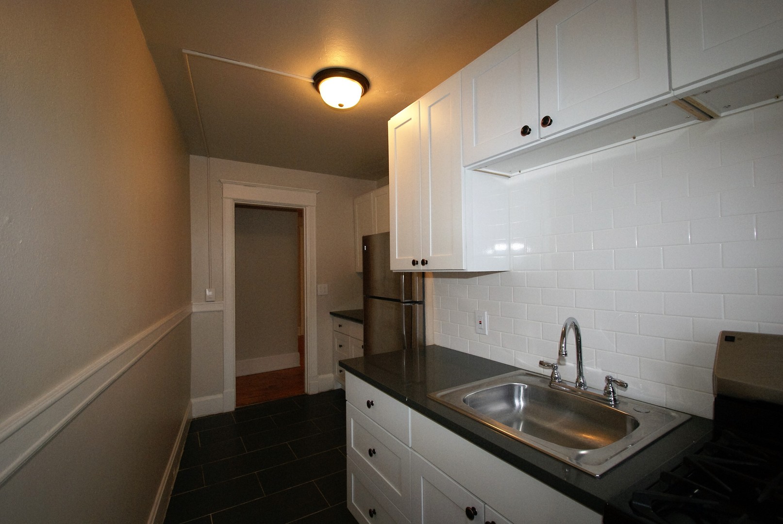 This studio apartment features Stainless Steel appliances, subway tile, designer cabinets, claw foot tub and handsome hardwood floors.