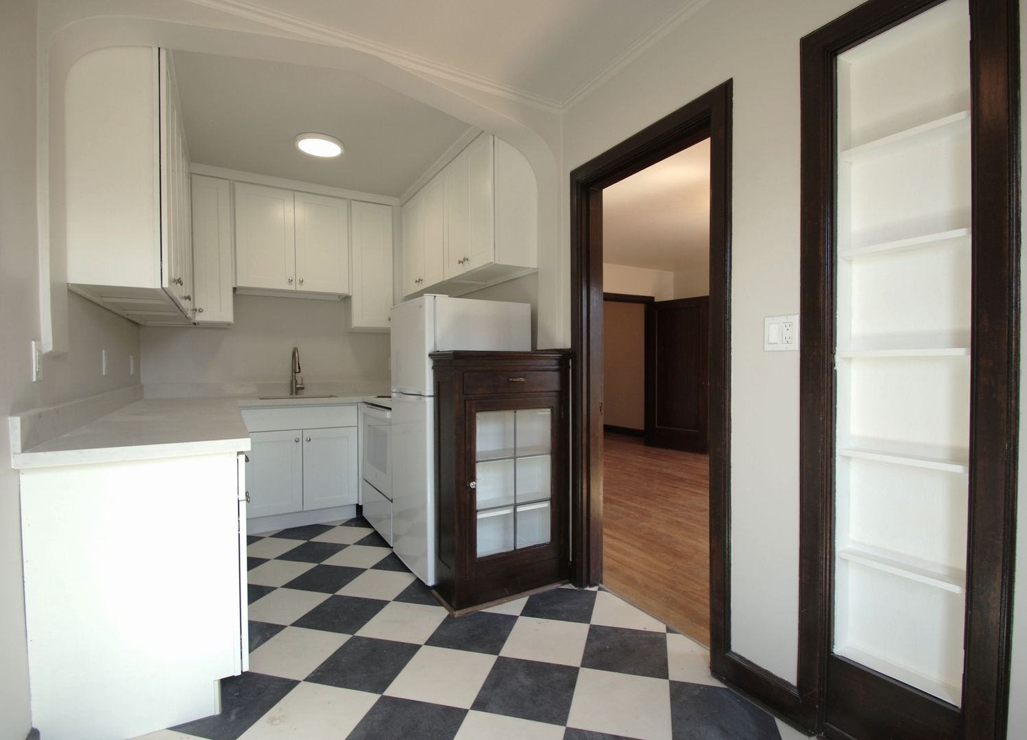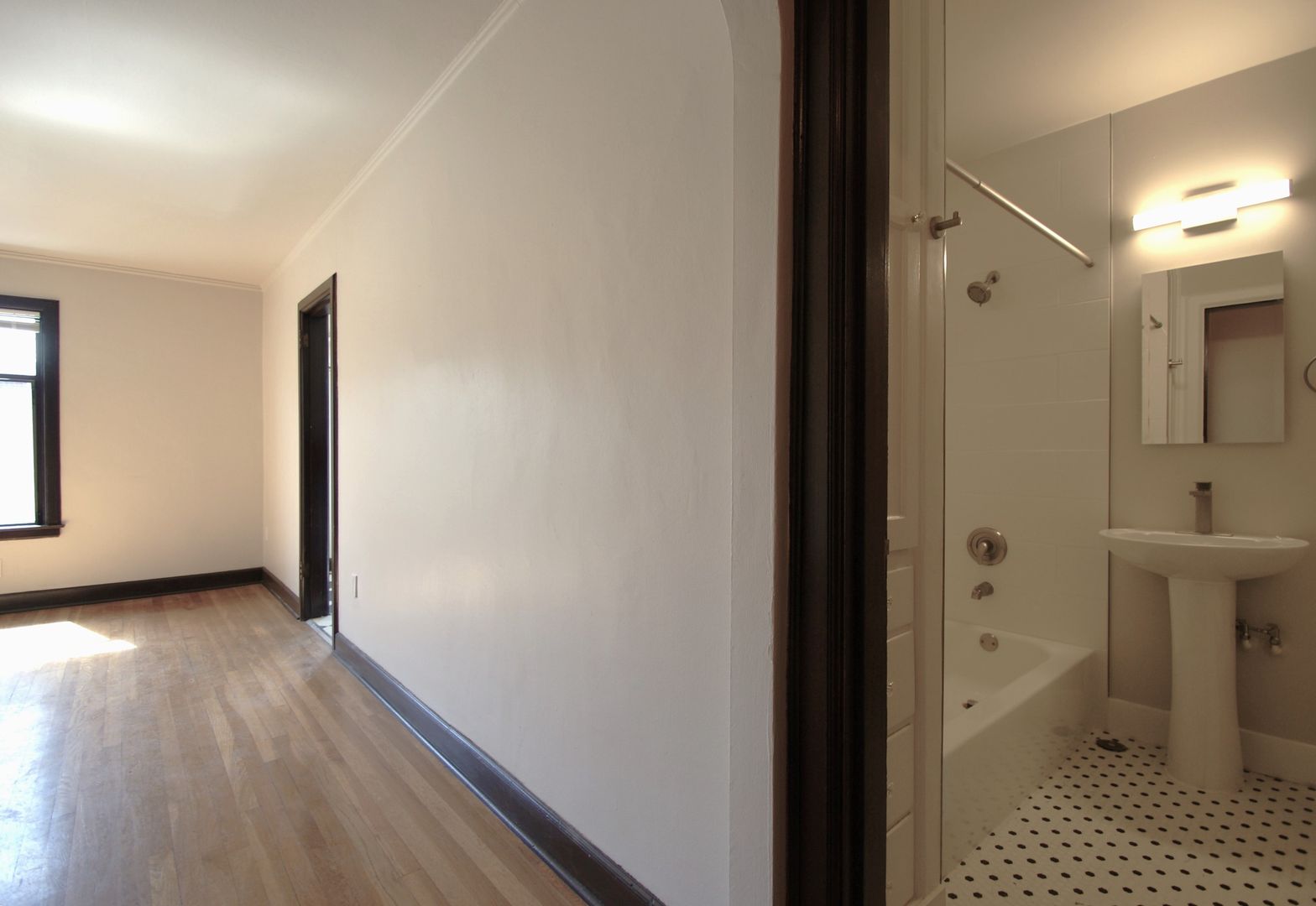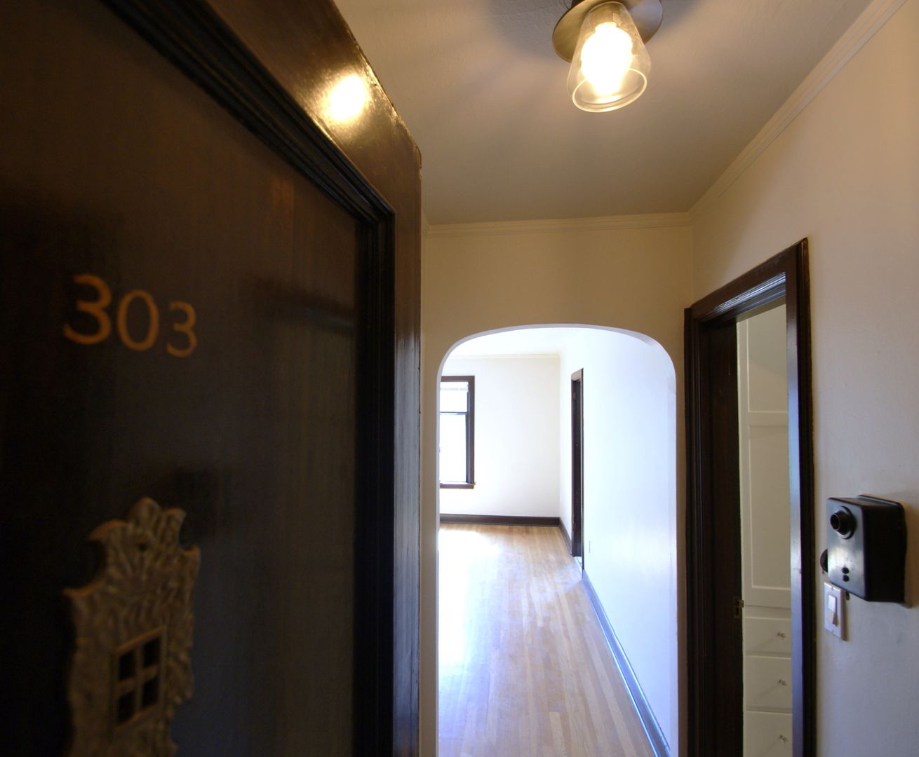 Unit 303 is a South facing studio with hardwood floors throughout, new vinyl in the kitchen and original tile bathroom floor. The kitchen cabinets have been updated, new tile shower surround and newer appliances.