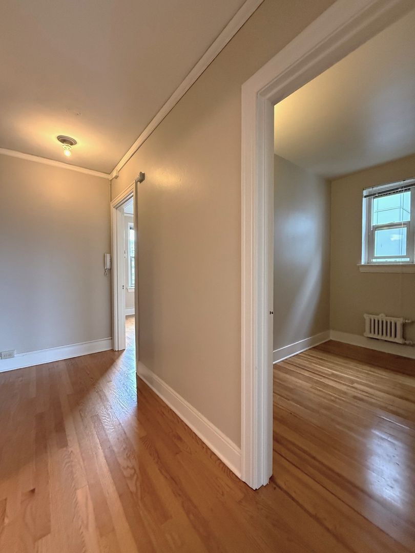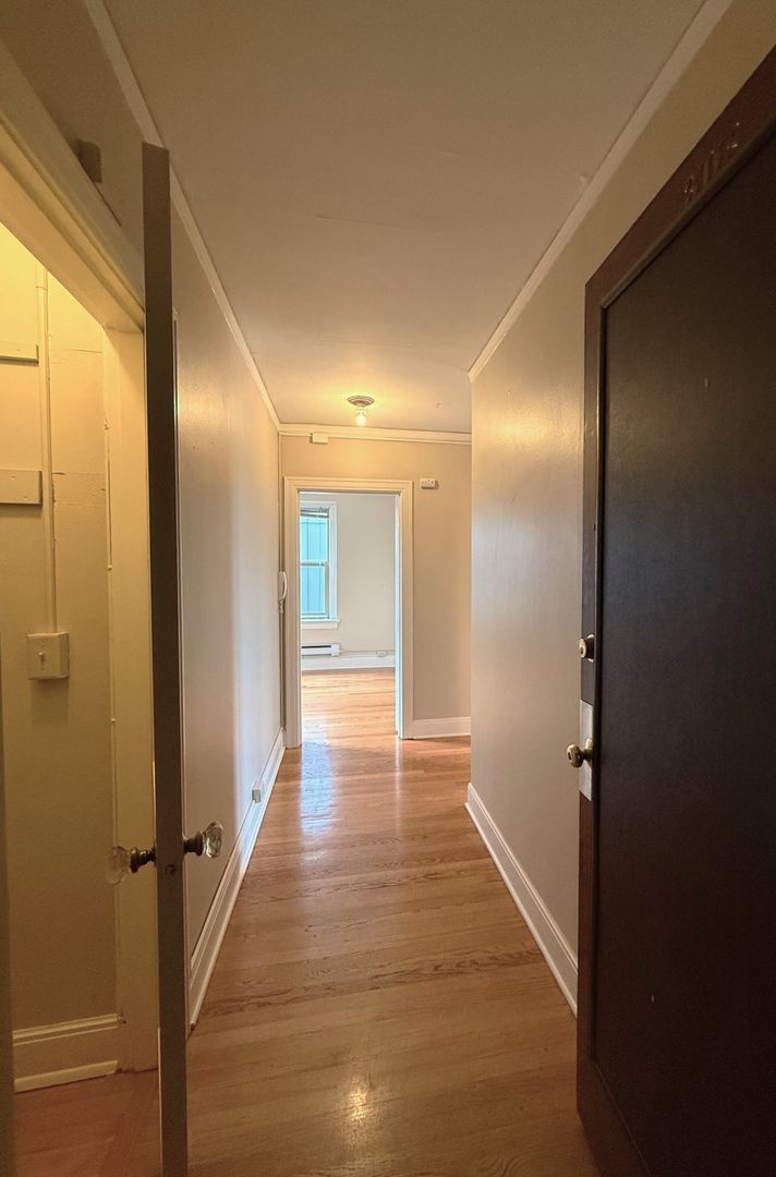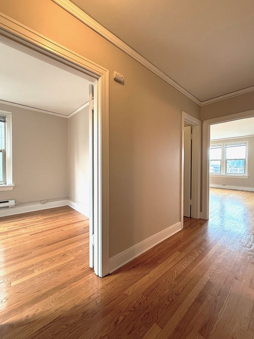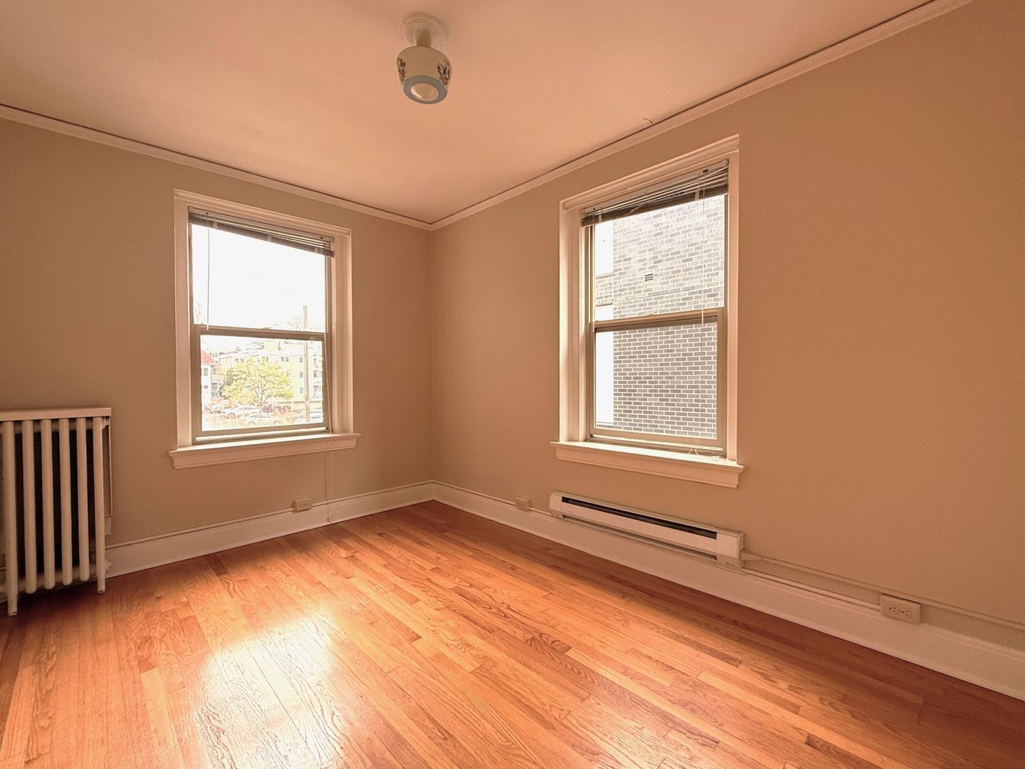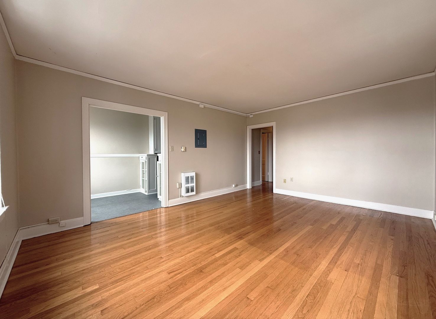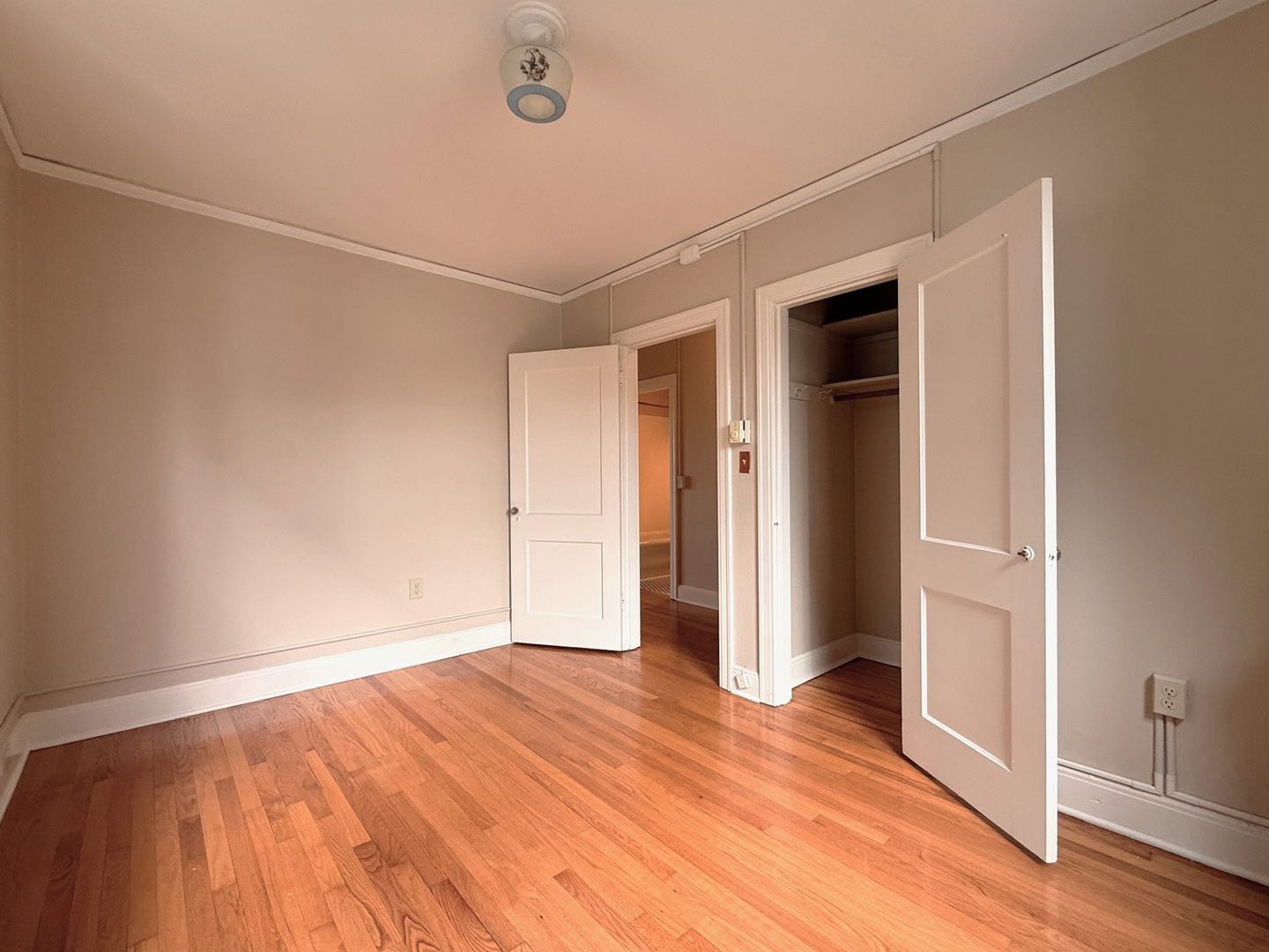 Unit 208 is situated on the South side of the building but has windows that face East and West which receive lovely natural light. There are hardwood floors throughout, new vinyl in the kitchen, and original tile flooring in the bathroom. There are several closets for storage including a sizeable walk-in closet. Enjoy the view of downtown from the breakfast nook in the kitchen. There is a $100 water, sewer, garbage fee per month.